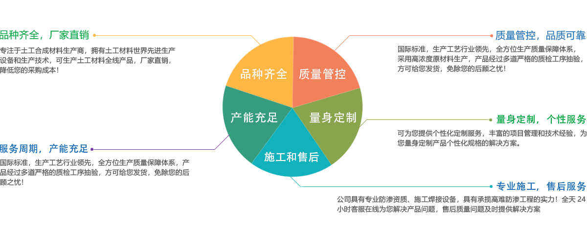 公司所有產(chǎn)品均采用國際標準組織生產(chǎn),并經(jīng)國家、市技術(shù)監(jiān)督局采標驗收,生產(chǎn)工藝及水平全國領(lǐng)先,屬國內(nèi)優(yōu)等水平,實物質(zhì)量達到國際先進水平。經(jīng)用戶、施工單位使用證明,質(zhì)量穩(wěn)定可靠、施工方便、價格合理、售后服務(wù)完善。產(chǎn)品主要應(yīng)用于農(nóng)業(yè)、海綿城市建設(shè)、公路、鐵路、垃圾填埋場防滲,水利、電力、水土保持及環(huán)境綠化與基礎(chǔ)建設(shè)領(lǐng)域,已被廣泛應(yīng)用于高速公路、鐵路、垃圾填埋場等多項國家重點工程,受到工程界專家及廣大用戶的一致好評。